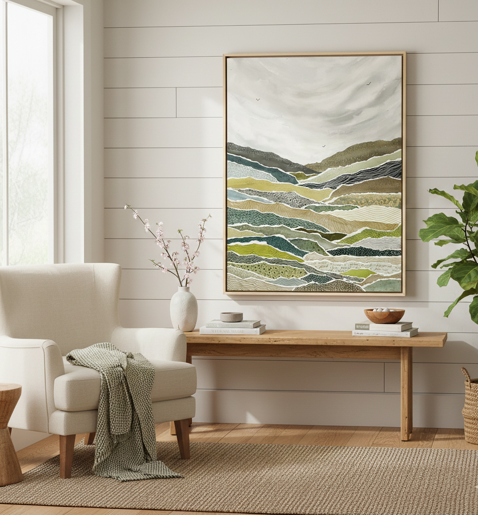 Learn how original layered landscape artwork can add peace and stillness to your home.